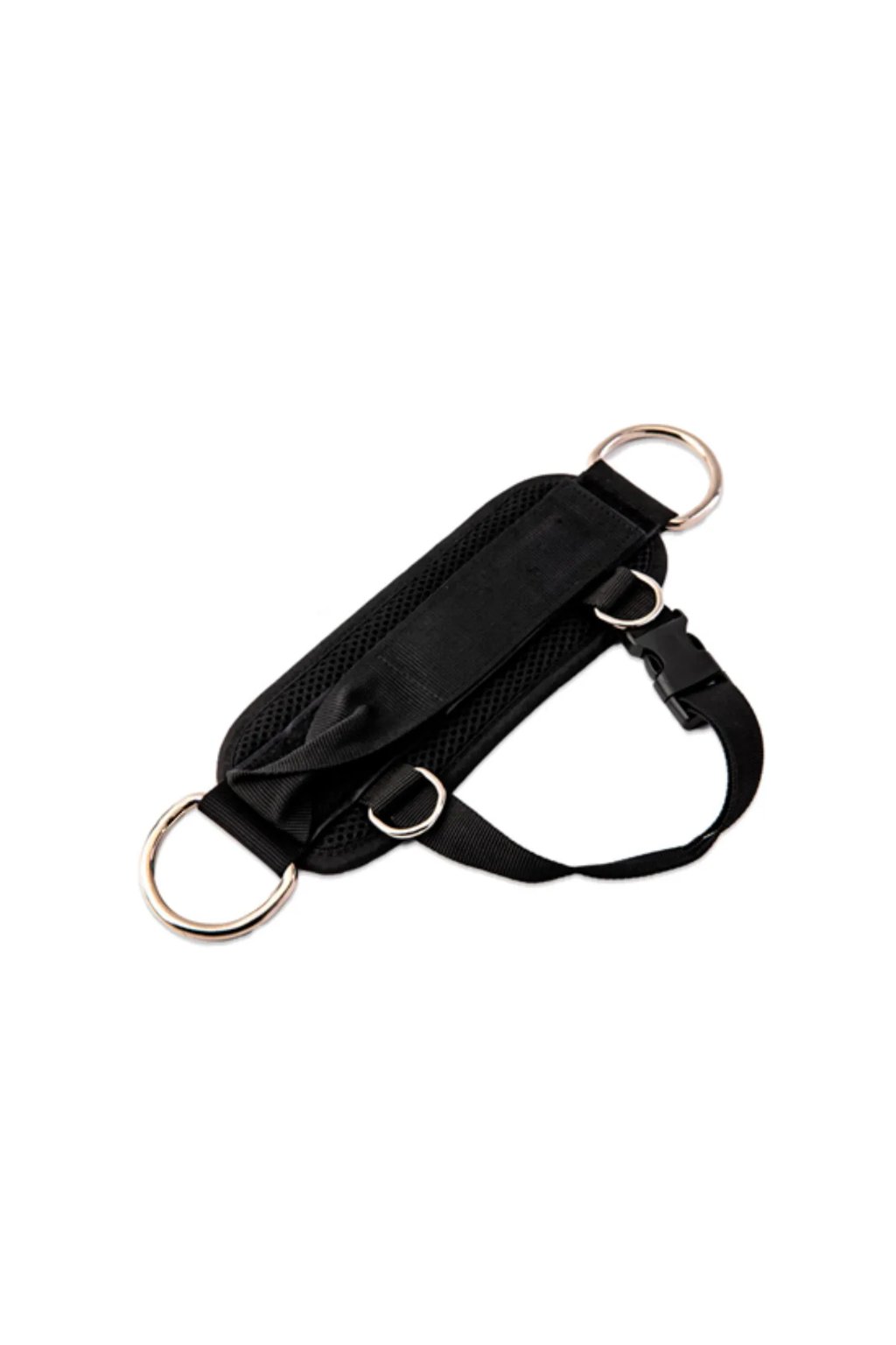 Měkké polstrování s prodyšnou strukturou zajišťuje vysoký komfort i při vyšší zátěži a delším tréninku. Nastavitelné popruhy umožňují přesné přizpůsobení, zatímco kovové D-kroužky poskytují bezpečné a stabilní připojení ke kladkovému systému. Díky odolnému textilnímu provedení je popruh vhodný pro každodenní používání v profesionálních fitness centrech i domácích posilovnách.